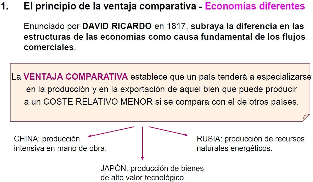 Sin embargo, David Ricardo matiza la teoría de las ventajas absolutas, al darse cuenta del hecho de que a España le convendrá producir aquel bien que le reporte una ventaja comparativa mayor. Vamos a ver en qué basa su teoría.