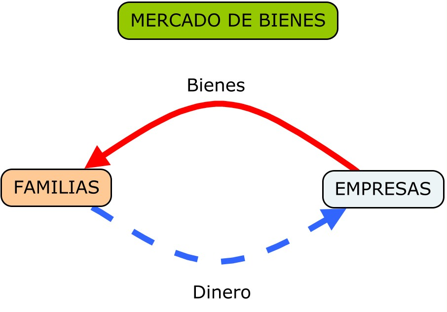 El mercado de bienes, en el cual las familias actúan como compradores de los bienes que ofrecen las empresas, que serán los vendedores. A cambio del bien, las familias pagarán el dinero correspondiente