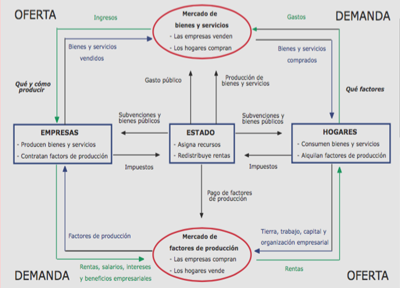 Las relaciones entre los distintos agentes económicos se reflejan en el flujo circular de la renta. Las empresas y familias se relacionan en el mercado de productos y factores. Ambos mercados están intercomunicados, así si no hay demanda de un bien esto afectará al mercado de factores (por ejemplo se contratarán menos trabajadores) y los desequilibrios de un mercado afectan al otro.