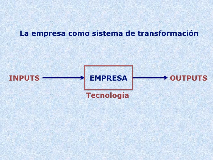 Al conjunto de recursos productivos se les llama también inputs (entradas) y a los bienes y servicios obtenidos outputs (salidas). Desde esta perspectiva se contempla a la empresa como un sistema que transforma los inputs en outputs a través de una tecnología determinada, tal como muestra el esquema.