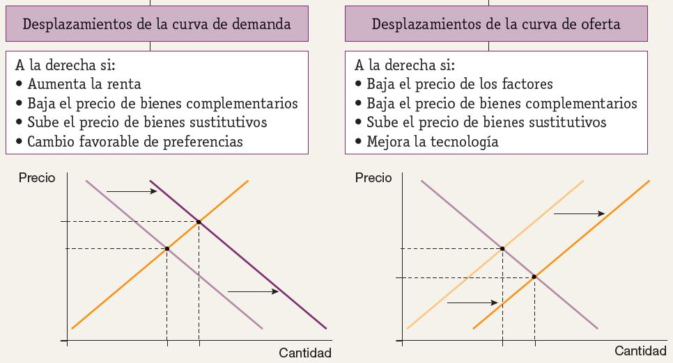 Un desplazamiento a la derecha de la curva de demanda (que en principio no tiene por qué producirse en paralelo a la demanda inicial) subirá el precio y la cantidad de equilibrio, y un desplazamiento a la izquierda bajará el precio y la cantidad de equilibrio