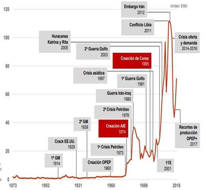 La evolución del precio del petróleo ha estado muy vinculada a conflictos en Oriente Medio y el mundo árabe Tras el pico que se produjo en 2008 el precio del petróleo bajó dramáticamente y no se ha recuperado totalmente, 11 años después son más bajos.