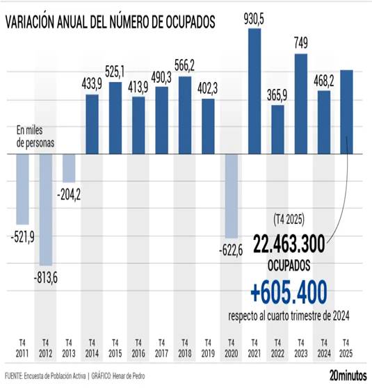 Los datos de la Encuesta de Población Activa (EPA), que ha publicado este martes el Instituto Nacional de Estadística, confirman que el mercado laboral sumó 605.400 empleos en 2025, hasta alcanzar un nuevo récord de 22,46 millones de ocupados. Todos los sectores de actividad crearon empleo en el conjunto del año, si bien el alza se concentró en los Servicios, con 369.900 cotizantes más, en un ejercicio en el que las actividades relacionadas con el turismo y la hostelería se beneficiaron de la llegada récord de viajeros internacionales. Le siguieron la industria (112.200), la construcción (79.500) y la agricultura (43.800).