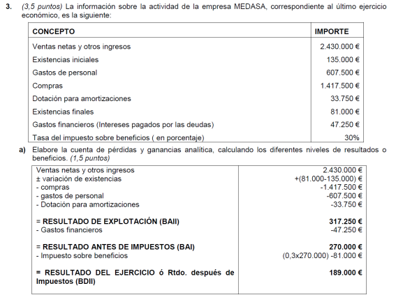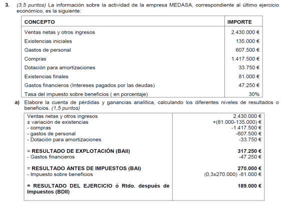Elabora la cuenta de resultados y realiza el análisis económico sabiendo que el valor del activo de la empresa es de 22.000 € y sus fondos propios de 16.000 €.