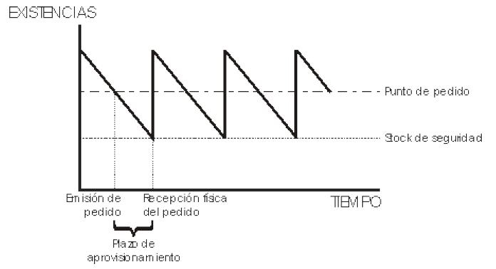 Cuando el nivel de existencias baja hasta el punto de pedido se gestiona un nuevo pedido siempre del mismo tamaño (Q). Mientras transcurre el plazo de aprovisionamiento el nivel de existencias ha bajado hasta el stock de seguridad.
