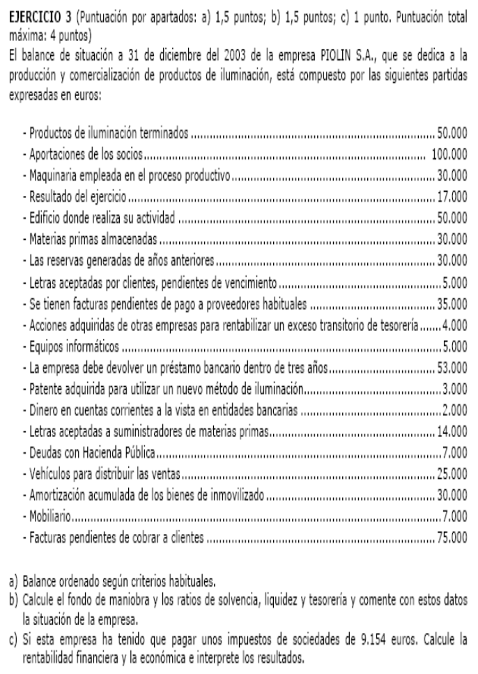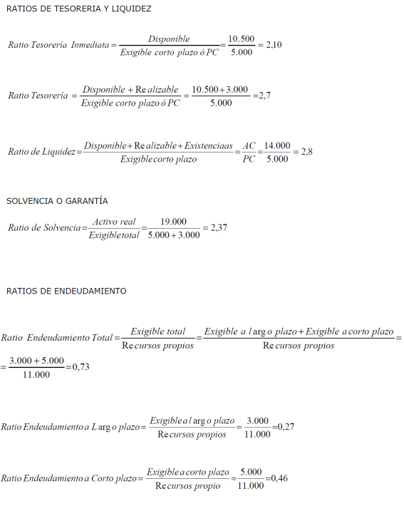 No existe Activo ficticio. El pasivo total asciende a 100.000.000 de pts. Ratio de inmovilizado = 1,25. Rentabilidad económica = 15%. Financiación Básica o Capitales permanentes = 71.685.000. Exigible a LP = 2.000.000. Los Recursos Propios se componen de Capital Social y Reserva Legal, siendo el importe de ésta el mínimo exigido por la Ley de SA., El coste de la deuda a largo plazo es el 5%. Esta empresa tiene registradas unas patentes por valor de 1.750.000. La composición del activo circulante es: Disponible/A.C. = 0,5; Realizable/A.C. = 0,25; Existencias/A.C. = 0,25. El impuesto de sociedades (35%) no ha sido todavía pagado.