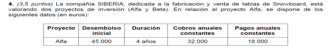 Tasa de inflación ( r): 10 %; plazo máximo de recuperación: 4 años y recursos financieros disponibles: 5.000€; En todos los proyectos la Inversión Inicial asciende a 2.500 € (2,5 puntos)