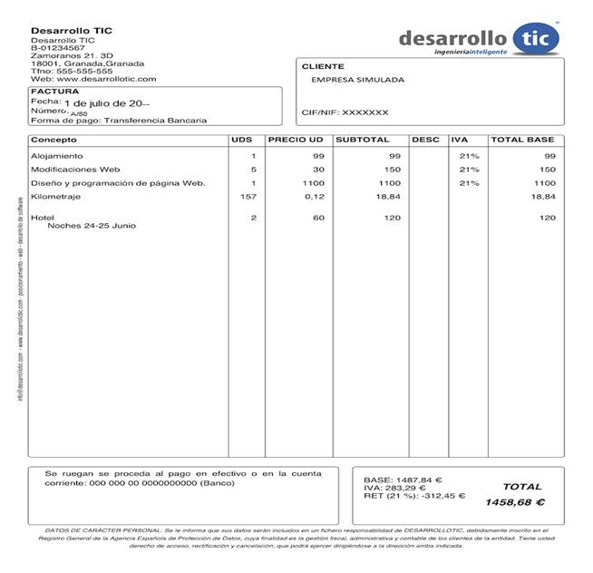 Se recibe la factura correspondiente a la página web, el pago se realizará mediante la cumplimentación de pagaré el día 7 de julio