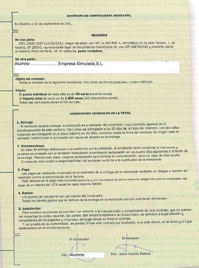 2._ Se procede a la adquisición de mobiliario.  Redacta el contrato de compra venta con los datos de tu empresa: