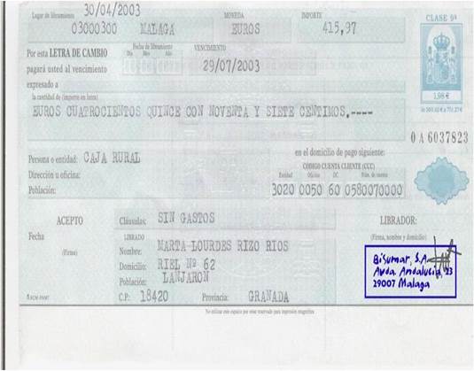 d)     El resto a través de una letra de cambio pagadera en Cajamar, domiciliada en Plaza Juan XXIII, 45 de Murcia, fecha de emisión el 12 de febrero CCC 1034-0064-26-000036593-2, vencimiento el 25 de junio. El dia 18 de marzo la letra es endosada a Construmur SA (PI La Capellanía, Nave 18, 30600 Archena). Diez días después de la emisión la letra es avalada por Federico Marín Iniesta, domiciliado en Calle Mayor, 68, 30120 de Aljucer. La letra tienen la cláusula sin gastos.