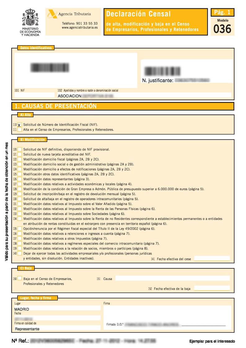 Cumplimenta el Modelo 036 Declaración Censal, de alta, modificación y baja en el Censo de obligados tributarios, para obtener el N.I.F. (Número de Identificación Fiscal) y alta de obligaciones tributarias.