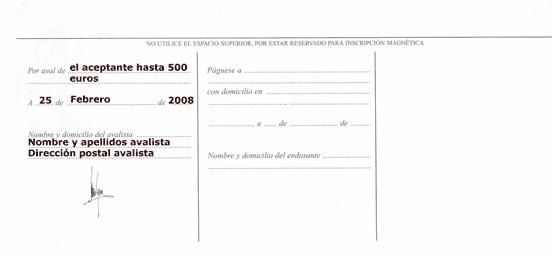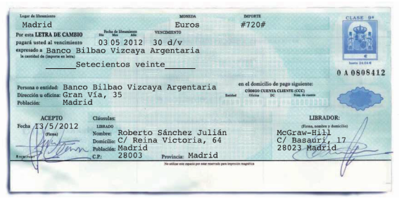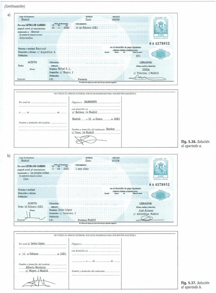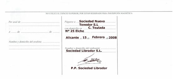 - Mediante una letra de cambio con fecha de emisión 15/05/0x y con vencimiento el día 15/07/0x, domiciliada en el Banco Popular, C/ Carlos V, 38. Toledo, número de cuenta 4530-0124-76-000012356-0 con la cláusula no a la orden. La letra es avalada diez días después de su aceptación por Lorente e Hijos SL, domiciliada en PI Virgen de Flores, Nave 43 de Álora. Fecha de aceptación 20/05/0x