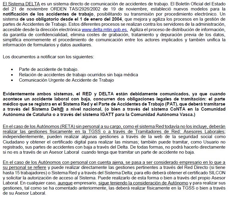 La Orden TAS/2926/2002, de 19 de noviembre establece los modelos para la notificación de los accidentes de trabajo. A partir del 1 de enero de 2004, esta notificación sólo es posible por vía electrónica a través del Sistema de Declaración Electrónica de Accidentes de Trabajo, más conocido como Delt@, accesible desde la web del Ministerio de Empleo y Seguridad Social.