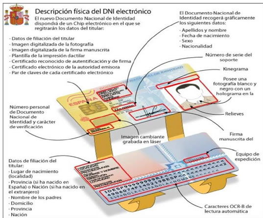 DNIe: incorpora un chip en el anverso con información digital. Los avances tecnológicos recogidos en el chip permiten conectar con la Administración de forma digital, hacer uso de su identidad electrónica, firmar documentos digitalmente y de forma remota. Para ello, es necesario un dispositivo hardware, como un lector de tarjetas integrado en el teclado, externo (vía USB) o a través de un lector PCMCIA, que permita la lectura de los certificados contenidos en el chip, y posibilite la conexión a los distintos servicios digitales, así como instalar los diferentes drivers necesarios para el funcionamiento del hardware.