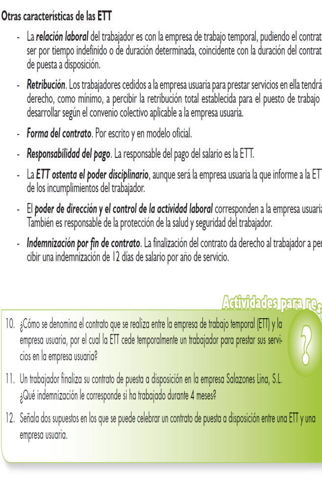 Empresa de Trabajo Temporal es aquella cuya actividad consiste exclusivamente en poner a disposición de otra empresa usuaria con carácter temporal trabajadores por ella contratados. Se dedican a contratar trabajadores para cederlos a empresas usuarias de forma temporal. La E.T.T. contrata trabajadores pero no los EMPLEA