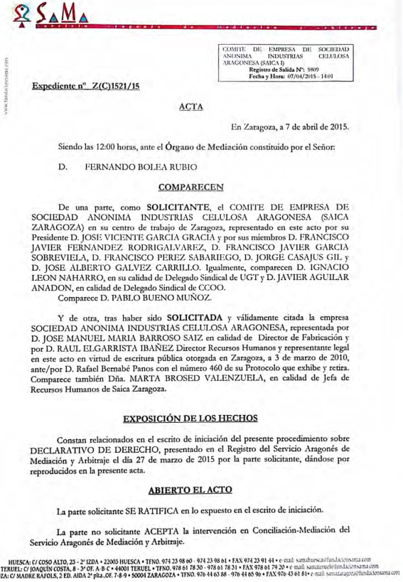 Añade la empres que "se encontró encima de la mesa" el pasado día 4 una convocatoria de reunión en el Servicio Aragonés de Mediación y Arbitraje (SAMA) a pesar de que las negociaciones parecía que marchaban por buen camino con el nuevo comité de empresa, con el que se habían mantenido seis encuentros desde el 18 de agosto de 2016 .