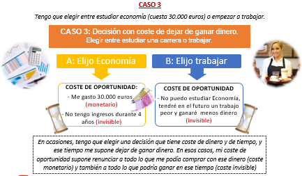 Imagina que ahora la decisión es estudiar economía (sin beca) o empezar a trabajar. ¿Cuál sería el coste ahora de estudiar? Podríamos pensar que el coste serían los 30.000 euros de coste de la matrícula y de vivir fuera, pero estaríamos cometiendo un gran error; Nos hemos olvidado de que si estudiamos estamos renunciado a trabajar y por tanto estamos renunciado a todos los ingresos que obtendríamos en esos 4 años. El dinero que dejo de ganar es lo que llamamos un coste invisible o no monetario.