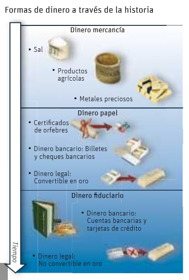 El dinero como medio de cambio apareció por primera vez en la historia en forma de mercancías de muy diverso tipo: ganado, aceite, sal, cobre, hierro, oro, plata, etcétera. Todas estas mercancías eran utilizadas como dinero al ser generalmente apreciadas por algún grupo social, por su alto valor de uso o por su escasez.