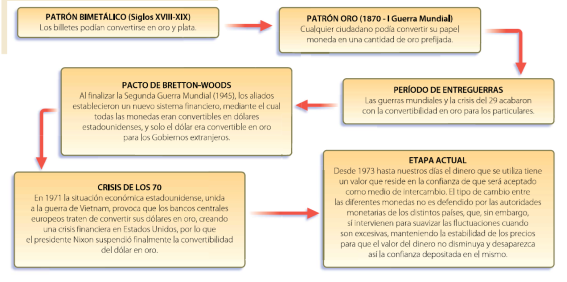 • Etapa Actual: Desde 1973 hasta hoy el dinero es dinero-fiduciario, es decir, no tiene ningún respaldo en términos de metales preciosos. El valor del dinero actualmente descansa en la confianza de cada individuo de que será aceptado como medio de pago por los demás. Si esta confianza desapareciese el billete sería inservible.
