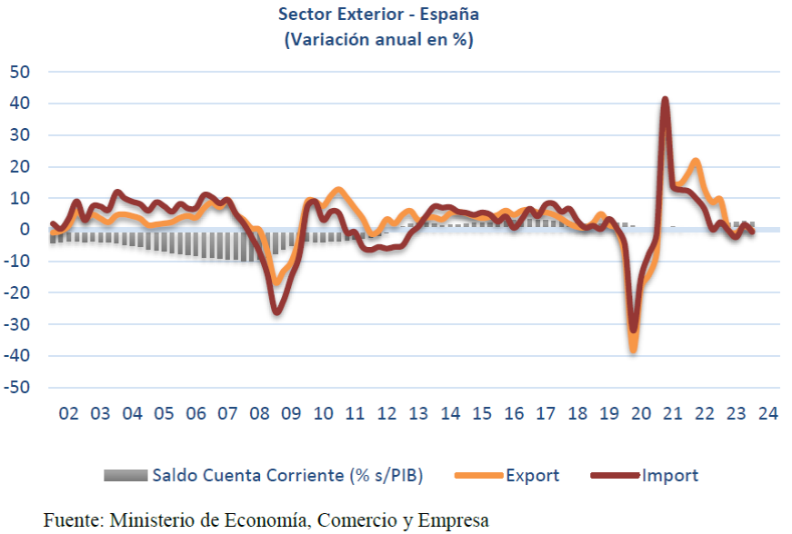 El deterioro de la balanza comercial desluce el buen comportamiento de las exportaciones, que crecieron un 22,9% anual hasta superar los 389.000 millones de euros, lo que representa un nuevo máximo histórico y una mejora de las previsiones que mantenía el Ejecutivo, que auguraba que no sería hasta 2027 cuando la economía española superará la barrera de los 400.000 millones de euros en ventas de bienes al exterior. “Se rebasará ya este año. Las exportaciones continuarán creciendo este año a un ritmo más moderado y también volverá a haber superávit por cuenta corriente. Las encuestas a doce meses y las encuestas de coyuntura son positivas”.
