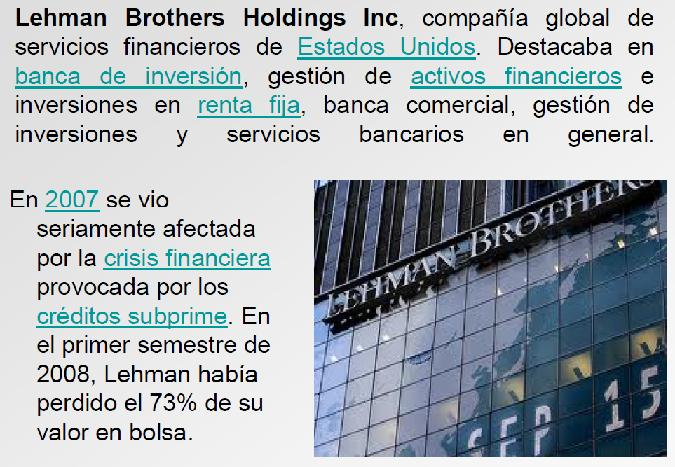 La caída de Lehman Brothers, el banco de inversión que se declaró en bancarrota el 15 de septiembre de 2008, contagió a otras entidades financieras y supuso el inicio de la crisis de las "hipotecas subprime".