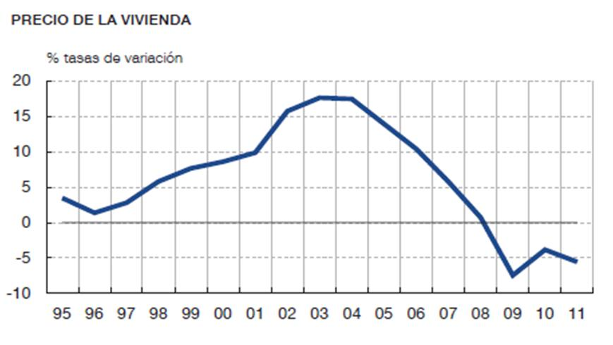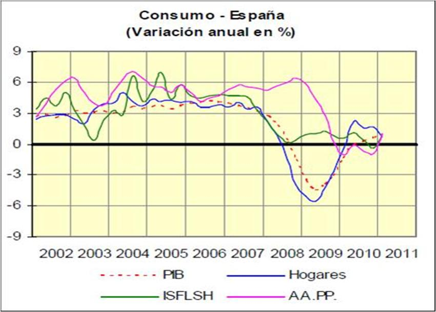 provoca caída de la inflación -0.1 en junio de 2009, la puesta en marcha de políticas expansiva dispara el gasto público o consumo de las AAPP. Posteriormente la inflación se estabiliza al incrementar por efecto del incremento del IVA consecuencia de los ajustes de la crisis de la deuda y la presión del precio del petróleo.