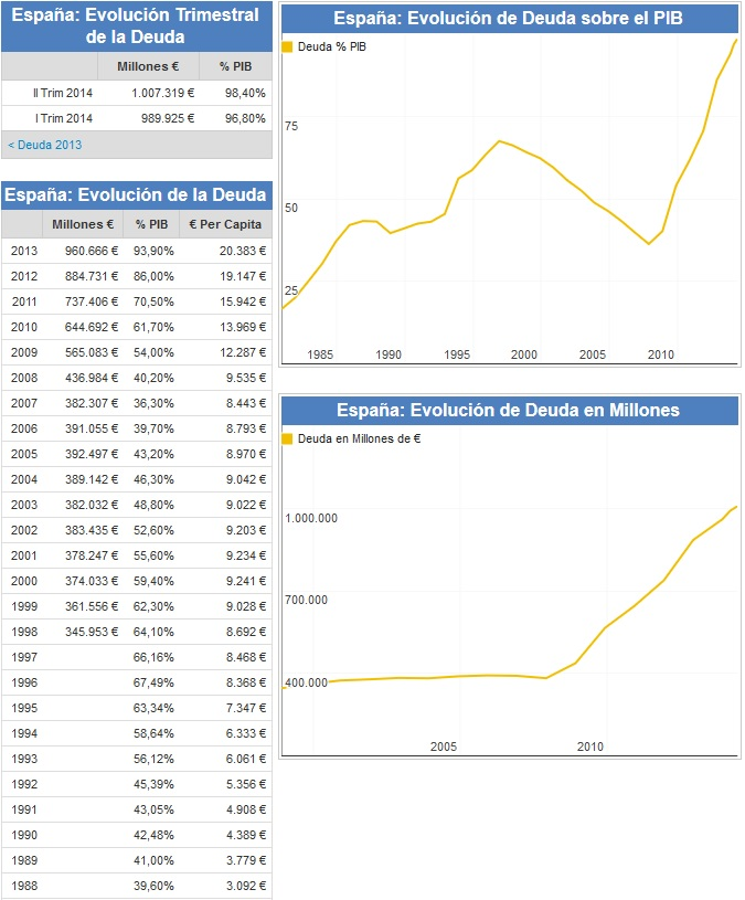 La deuda pública o deuda soberana, también se ha incrementado en los últimos años de crisis. En el siguiente enlace se muestra su evolución desde el año 1998: deuda pública de España.