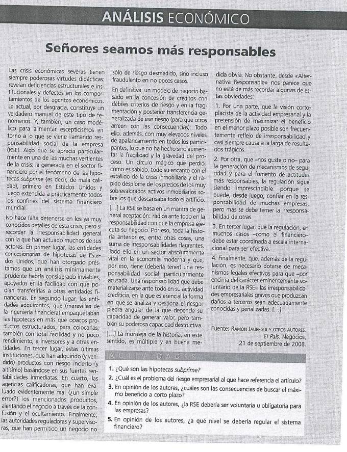 El convencimiento no ha crecido por generación espontánea. Antes ha leído periódicos en los que se dice que la crisis financiera originada en EEUU es la peor desde la Gran Depresión de los años 30. «Entonces debe ser gordo», piensa. Sigue leyendo los diarios y, pese a las crípticas informaciones que vislumbra —«la economía parece tener un lenguaje sólo para entendidos», se dice— consigue hacerse una idea general de lo que ocurre.