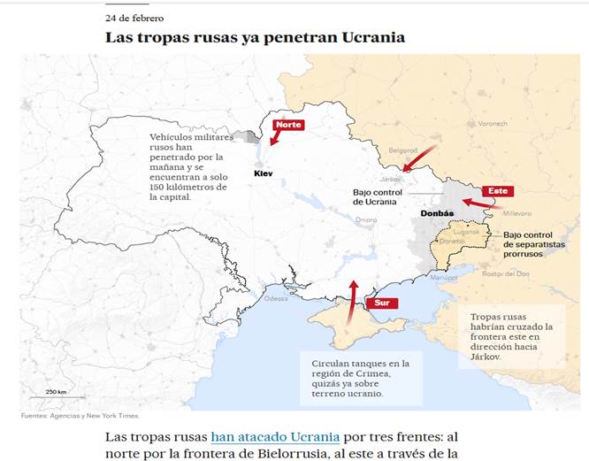 Las tropas rusas han atacado Ucrania por tres frentes: al norte por la frontera de Bielorrusia, al este a través de la frontera con Rusia, y en el sur desde Crimea, la península que Rusia invadió y anexionó en 2014. El gobierno ucranio denuncia “un ataque a gran escala desde múltiples direcciones”.