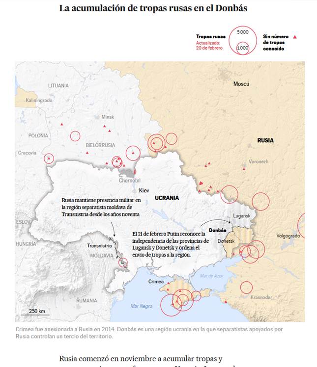 El embajador de Estados Unidos ante la Organización para la Seguridad y la Cooperación en Europa (OSCE), Michael Carpenter, calculó el viernes que entre las tropas rusas instaladas junto a la frontera ucrania, las que Moscú mantiene en Crimea y las desplegadas en Bielorrusia, el Kremlin puede tener sobre el terreno a entre 169.000 y 190.000 militares en Ucrania y sus cercanías. A ese importante despliegue, hay que sumar los alrededor de 2.000 militares que, según datos del think tank polaco Warsaw Institute, Moscú mantiene en Transnistria, una región cuya población de lengua y cultura rusa declaró su independencia de Moldavia en 1990.