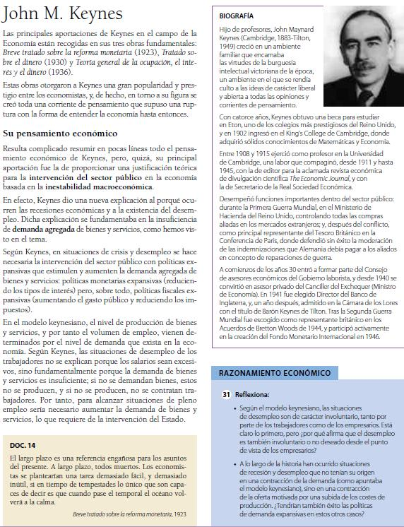 John M. Keynes, economista inglés que sentó las bases de la macroeconomía, o estudio de la economía a nivel nacional. Analizó los efectos de la intervención estatal, a través de la política económica, sobre el crecimiento económico de un país y, por tanto, sobre el nivel de empleo y de inflación. Su obra más importante, La Teoría General del Empleo, el Interés y el Dinero, se publicó en 1936, y tuvo una gran influencia en la social-democracia tras la segunda guerra mundial.