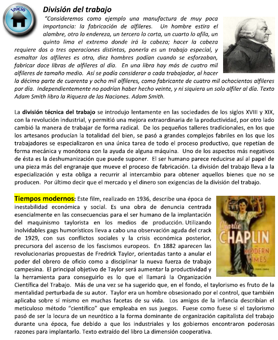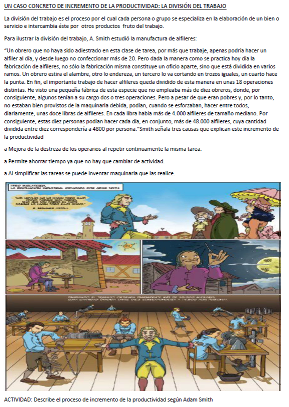 “Un obrero que no haya sido adiestrado en esa clase de tarea,...por más que trabaje, apenas podría hacer un alfiler al día, y desde luego no podría confeccionar más de 20. Pero dada la manera como se practica hoy día la fabricación de alfileres, no sólo la fabricación misma constituye un oficio aparte, sino que esta dividida en varios ramos, ... Un obrero estira el alambre, otro lo endereza, un tercero lo va cortando en trozos iguales, un cuarto hace la punta, ...En fin, el importante trabajo de hacer un alfiler queda dividido de esta manera en unas 18 operaciones distintas, ...He visto una pequeña fábrica de esta especie que no empleaba mas de diez obreros, donde, por consiguiente, algunos tenían a su cargo dos o tres operaciones. Pero a pesar de que eran pobres y, por lo tanto, no estaban bien provistos de la maquinaria debida, podían, cuando se esforzaban, hacer entre todos, diariamente, unas doce libras de alfileres. En cada libra había más de 4,000 alfileres de tamaño mediano. Por consiguiente, estas diez personas podían hacer cada día, en conjunto, más de 48,000 alfileres, cuya cantidad dividida entre diez correspondería a 4,800 por persona”