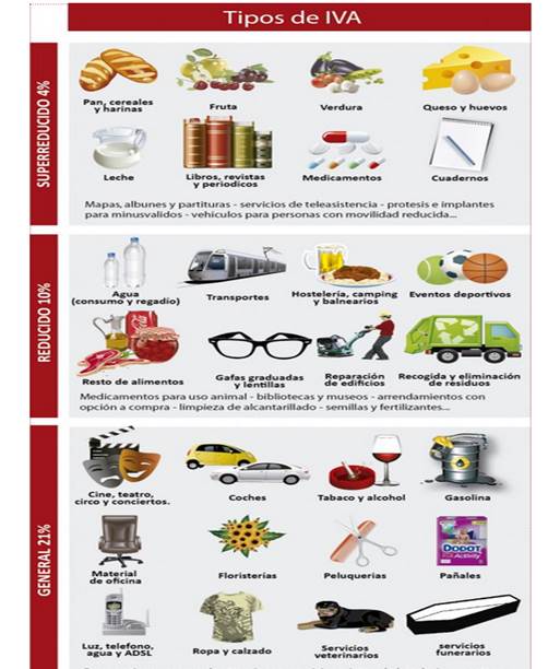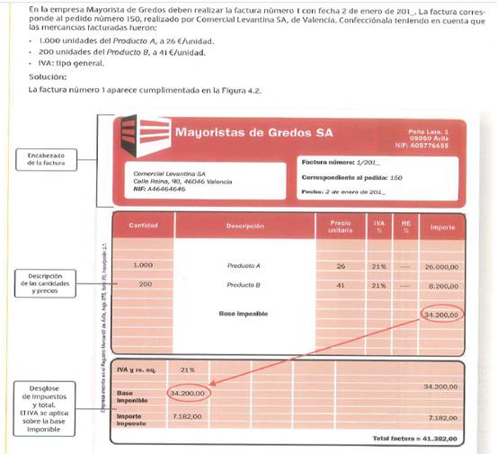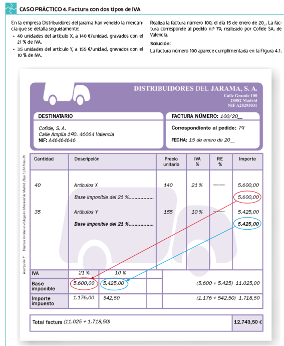 - El tipo o tipos impositivos aplicados a las operaciones, es decir, el porcentaje de IVA de los artículos. Puede ser igual o no para todos los artículos (4%, 10%, 21%). En el ejemplo: 21%