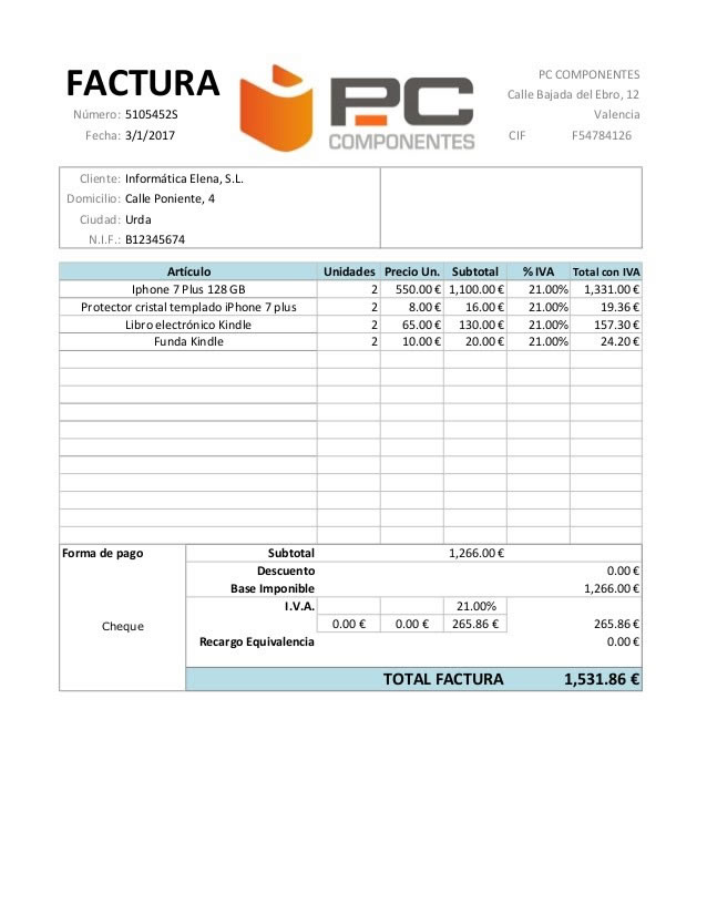 - El importe total de la factura: se calcula sumando la base imponible o total bruto y el importe correspondiente al IVA. En el ejemplo: 7.160 + 1.503,60 = 8.663,60€