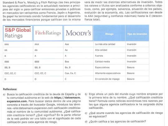 COMPLETA EL SIGUIENTE CUADRO SEGÚN LA CALIFICACIÓN DE LOS TÍTULOS DE DEUDA PÚBLICA DE CADA UNO DE ESTOS PAÍSES: