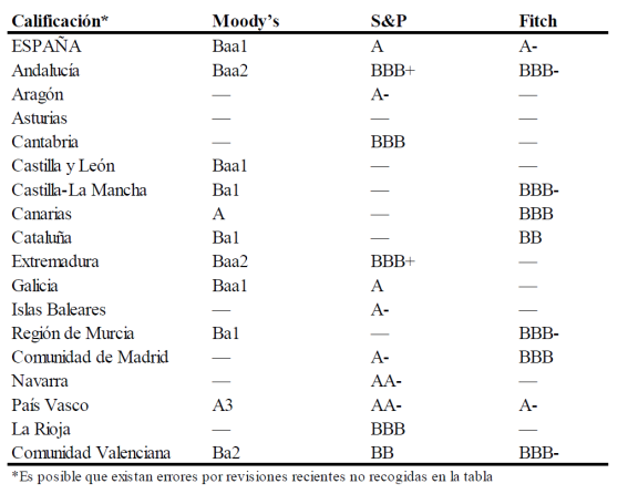 COMPLETA EL SIGUIENTE CUADRO SEGÚN LA CALIFICACIÓN DE LOS TÍTULOS DE DEUDA PÚBLICA DE CADA UNA DE ESTAS CCAA: