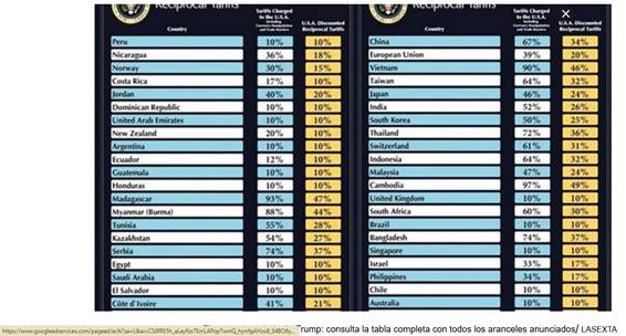 Trump exhibió un cartel con dos columnas: una con los aranceles y barreras que supuestamente los países imponen a los productos estadounidenses -incluidas medidas indirectas como la manipulación de divisas o regulaciones sanitarias- y otra con las nuevas tarifas que EE.UU. aplicará en respuesta a esas naciones.