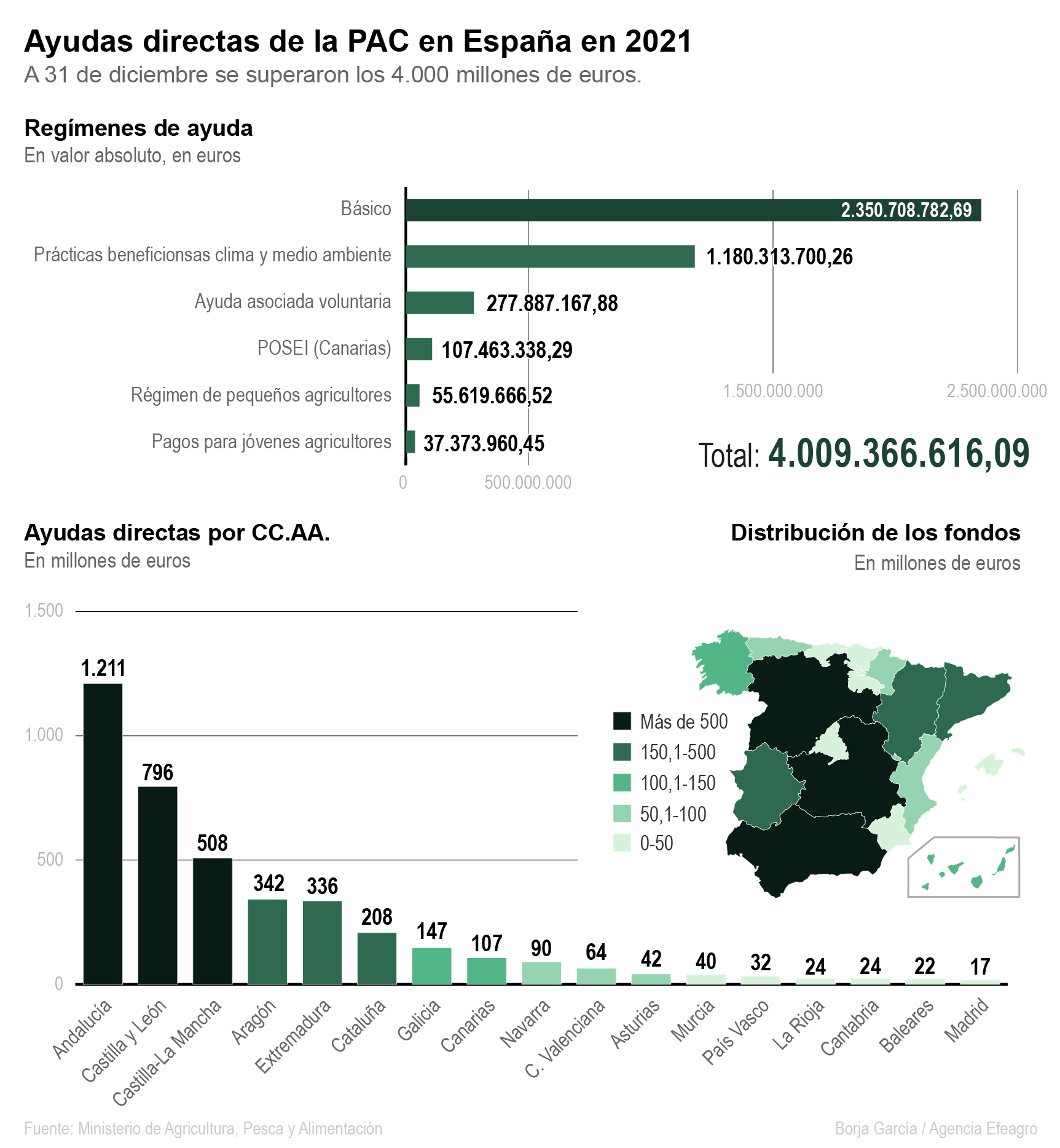 En líneas generales la agricultura es un sector que tiene más peso en el PIB de los países mediterráneos que en los del centro y norte de Europa. España es una nación receptora de ayudas. Sin embargo, en términos absolutos Alemania, Francia e Italia reciben más fondos para subvencionar el sector agrícola. En términos relativos las ayudas son más cuantiosas para países como Portugal, Irlanda o Dinamarca.