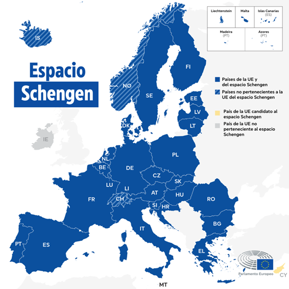 Todos los estados de la UE son parte de Schengen, excepto Irlanda, que tiene una cláusula de exclusión voluntaria, así Chipre que se supone que se unirá a Schengen.