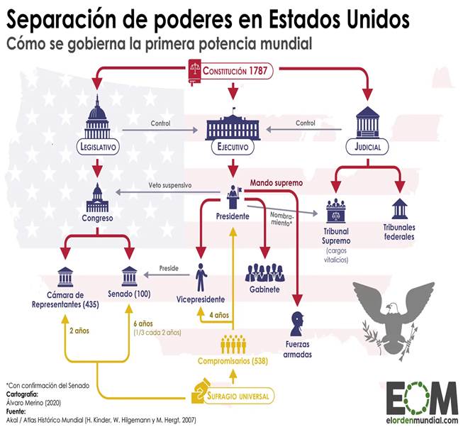 Además, la Constitución de 1787 establece un régimen presidencialista en el que todo el poder ejecutivo se concentra en una sola persona que ejerce a la vez como Jefe de Gobierno y Jefe de Estado. Así, la Carta Magna estadounidense reconoce la siguiente división de poderes: