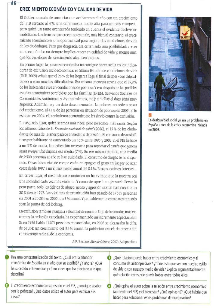 - CRECIMIENTO ECONÓMICO: se define como el incremento de la producción de bienes y servicios. Es deseable porque al crecer la producción se suele generar empleo, mejora el nivel de vida, se recaudan más impuestos... Con todo, estas ideas hay que matizarlas, ya que habrá que estudiar y analizar cómo se ha crecido y a qué precio, es decir, si se ha deteriorado el medio ambiente o si han empeorado las condiciones de trabajo, y cómo se ha repartido la renta que ha generado ese crecimiento. El crecimiento económico se mide con las tasas de variación del Producto Interior Bruto (PIB) y el Producto Nacional Bruto (PNB) principalmente.