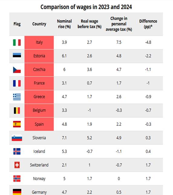 En Francia, los salarios reales crecieron un 0,7%, pero el tipo impositivo medio personal aumentó un 1,7%, lo que se tradujo en unos ingresos reales después de impuestos inferiores a los de 2023.