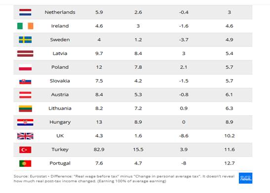 En Turquía, a pesar de un aumento del 3,9% en el tipo impositivo medio personal, un aumento sustancial del 15,5% en los salarios reales condujo a unos ingresos reales después de impuestos significativamente más altos en 2024 en comparación con 2023. Sin embargo, algunos críticos han acusado a la oficina nacional de estadística de manipular las cifras de inflación.