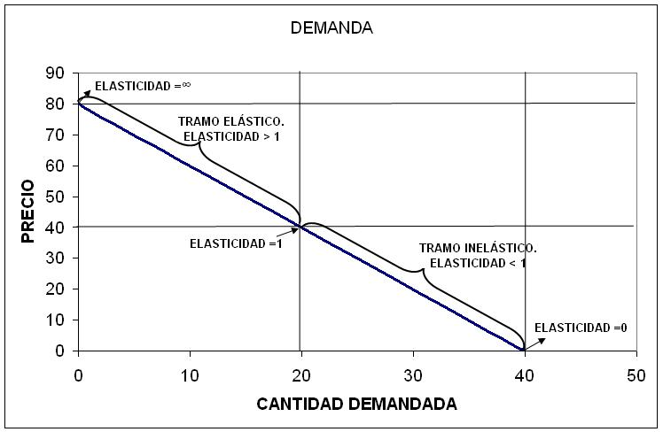 De forma más genérica, llegaremos a la siguiente conclusión sobre la elasticidad de una demanda rectilínea en sus distintos puntos: