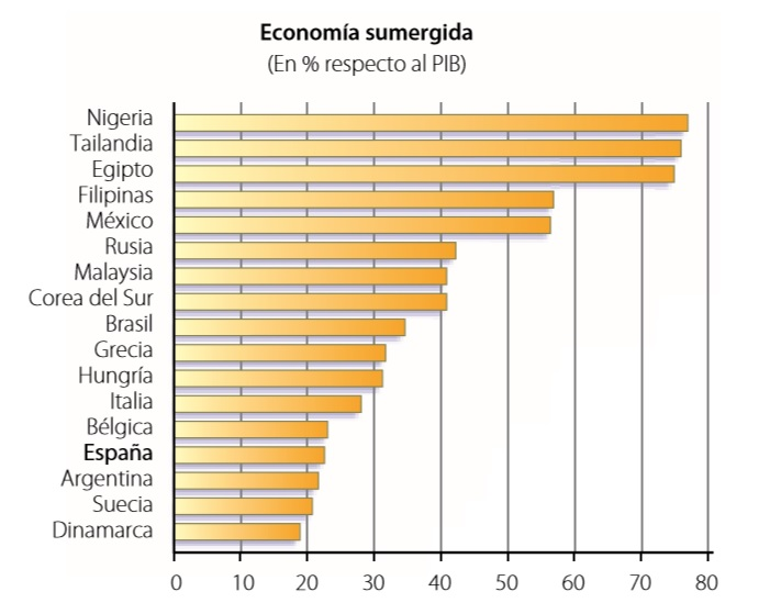 5. Compara a España con el resto de países de su entorno y comenta los resultados. ¿Qué país tiene mayor economía sumergida? ¿Y menor? ¿Cómo está España al respecto?