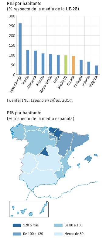 Los españoles son cada vez más pobres si se comparan con el resto de los europeos. Desde 2007, el PIB per cápita —la riqueza del país dividida entre sus habitantes— sólo ha crecido un 3,4%. Un avance 5,5 puntos inferior al de la media de la zona euro, que se eleva al 8,96%. La brecha es todavía mayor si se compara con el conjunto de la Unión Europea. El PIB per cápita de los ciudadanos comunitarios repunta un 13,4%, diez puntos más.