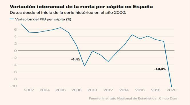 El PIB per cápita de España cae un 10,3% en 2020, tras seis años al alza 17 DIC 2021