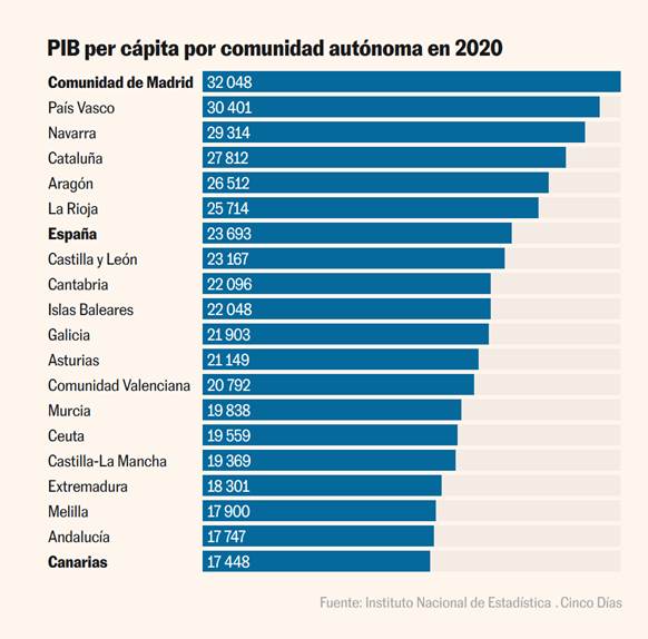 Por regiones, Madrid registró el PIB per cápita más alto del 2020, con 32.048 euros, un 35,5% superior a la media nacional; mientras que Canarias se situó en un 26,4% por debajo de esta marca, con la menor renta per cápita del país: 17.448 euros.