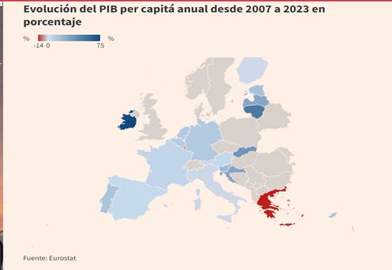 El PIB per cápita del conjunto de los miembros de la UE creció de 2007 a 2023 un 13,4%, diez puntos más que el de España.