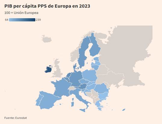 En 2023 (último dato disponible), el PIB per cápita español fue de 25.210 euros, frente a los 31.750 de la eurozona y los 28.930 de la UE. Cabe recordar que las cifras están ajustadas a paridad de poder adquisitivo, lo que permite comparar los niveles de vida entre países eliminando las diferencias de precios.